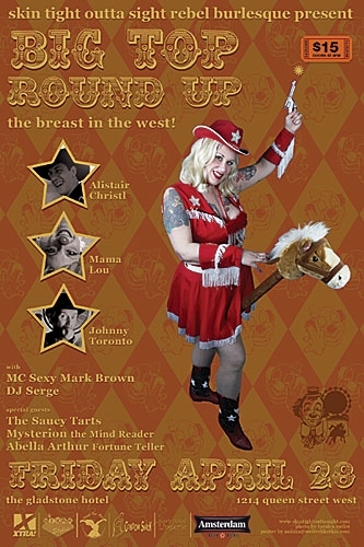 It’s a travelling old west circus that has just rolled into your town! Those vaudevillian vixens of Skin Tight Outta Sight have rounded up a six-shooter ballyhoo with all the fixins! Grab your little doggies for the centre ring; if this Big Top don’t tip over, someone’s gonna lose an eye! With MC Sexy Mark Brown aka “The Vegan Cowboy,” DJ Serge, and Special Guests, Mama Lou (NYC Circus Performer Extraordinaire); the hillbilly music stylings of Alistair Christl, accompanied by Rachel Melas from Swamperella; comic genius Johnny Toronto; and Queen West Cancan troupe, The Saucy Tarts. Mysterion the Mind Reader and Psychic Tarot Reader, Abella Arthur provide the pre-show and intermission curiosities. And of course, the night features an unparalleled Girl Show by Skin Tight Outta Sight!