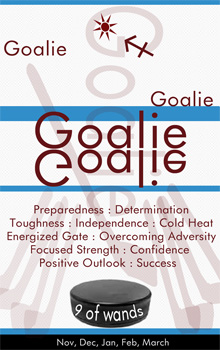 The goalie ensures the 9 of Wands puck does not get into the net and helps his or her teammates play defensively. Yet the goalie, in large part, stands and skates alone within a confined space.